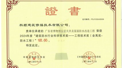 “精筑细作,守护典藏”,由科顺股份独立承接修缮的广东省博物馆五层天井及屋面防水改造项目,入围 2024 年度建筑防水行业科学技术奖 - 工程技术奖(金禹奖 )银奖!