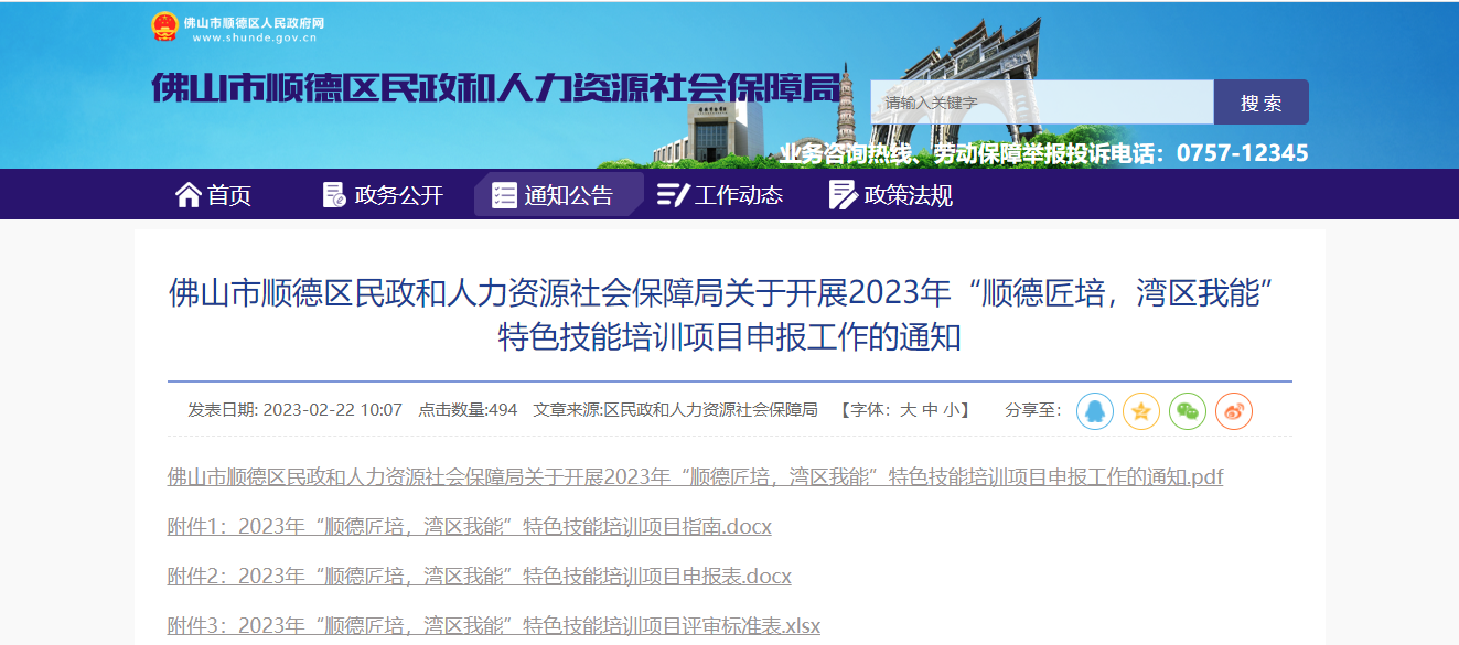 佛山市顺德区民政和人力资源社会保障局发布《关于开展 2023 年“顺德匠培,湾区我能”特色技能培训项目申报工作的通知》