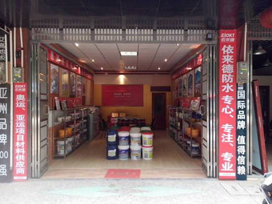 依来德祁阳防水旗舰店,坐落于新兴南路建材商贸圈,占地面积120多平米。本次加盟门店经过精心选址,最大限度集成区域地理优势和资源优势,全方位打造品牌形象。整个店面的设计与布局、产品陈列均按照品牌形象店标准精心打造,店面设有防水涂料展示区、堆头展示区、粉料展示区等展区陈列,产品结构包括防水材料、瓷砖胶、填缝料等三大系列,针对屋面、外墙、地下室、厨卫间、阳台等施工部位提供一应俱全的产品服务。为与客户的进一步交流提供便利,店面另设有接待台、会客室等。