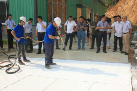 科顺应用技术部总监叶吉向考察客人介绍了科顺机械化施工的成果。他表示,随着中国经济的不断发展,市场对工人的需求越来越多,但是传统的施工既不能保证品质,也不能提升效率。机械化的施工,提高施工效率、保证施工品质,是防水行业发展的必然趋势。随后,技术团队为嘉宾展示了一场别开生面的机械化施工演练——喷涂聚氨酯防水涂料、喷涂聚合物水泥防水涂料、喷涂速凝橡胶防水涂料以及APF-3000的施工。机械化的防水施工,给嘉宾带来了防水新体验,大家也对科顺的技术赞不绝口。