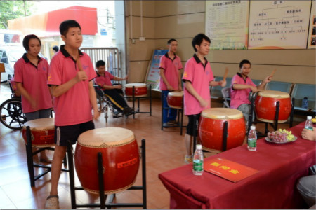 活动的最后,由仁爱园仁残疾人组成的鼓乐队进行了“仁爱飞扬”的击鼓表演。台上的每个表演者认真的神态无不触动了每一位来宾的心灵。