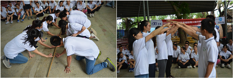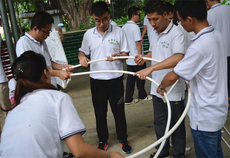 正式开始前,参训人员进行分小组、起队名、口号、队歌、设计队伍造型并展示等前期的准备工作。“齐眉棍”是本次拓展的热身训练项目,要求10位学员用食指托起竹竿从额眉处水平下降至地面,且食指不可脱离木棍,考验的是如何执行目标的统一,领导者、执行层应如何有节奏地完成一致的目标,更重要的是考验领导者的思维模式。主动上台的10名学员都出色地完成了任务。