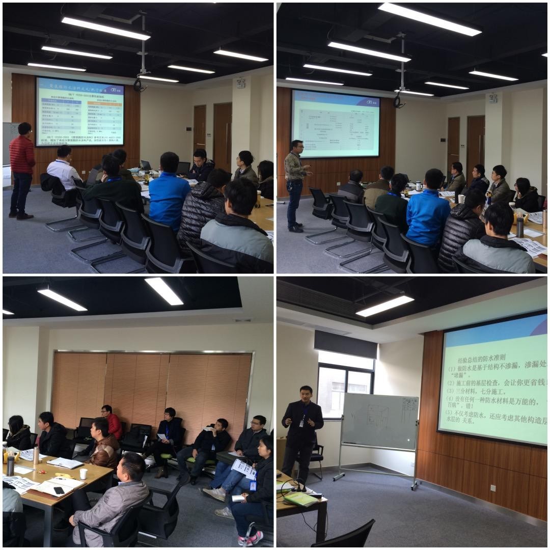 卷材研发经理黄祖行、中级涂料工程师陈立义和依来德研发经理黄莉恒分别为大家进行了“防水卷材产品介绍”、“聚氨酯防水涂料产品简介”、“水性涂料产品介绍”的专业知识培训,此行还有研发部门的同事一起旁听,整个课程为大家对科顺防水卷材涂料到家装产品进行了一次系统的梳理。