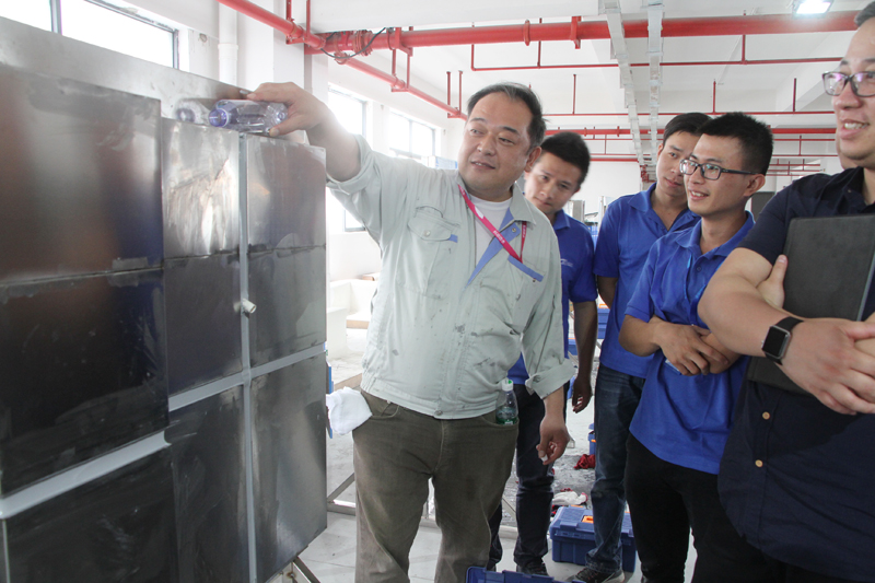 ▲讲师小林成夫正在为学员施工实操作业进行点评。