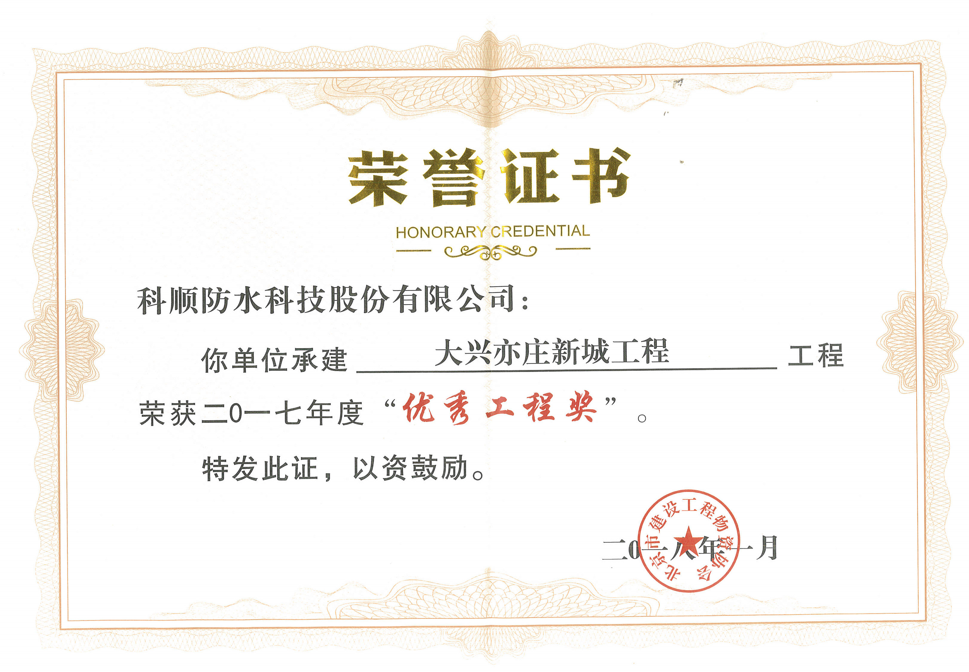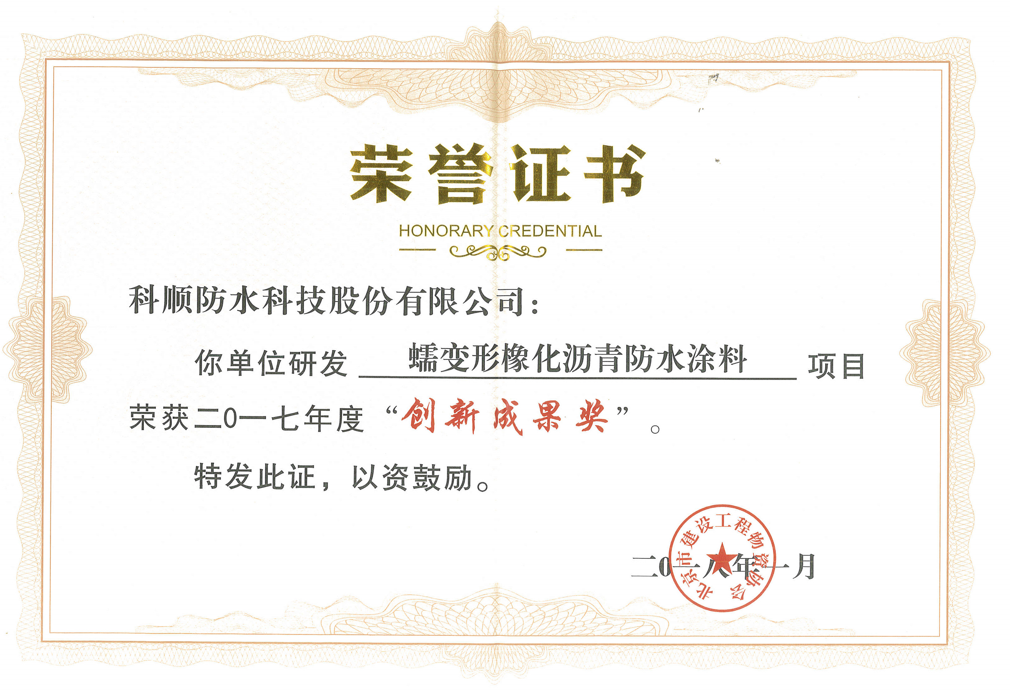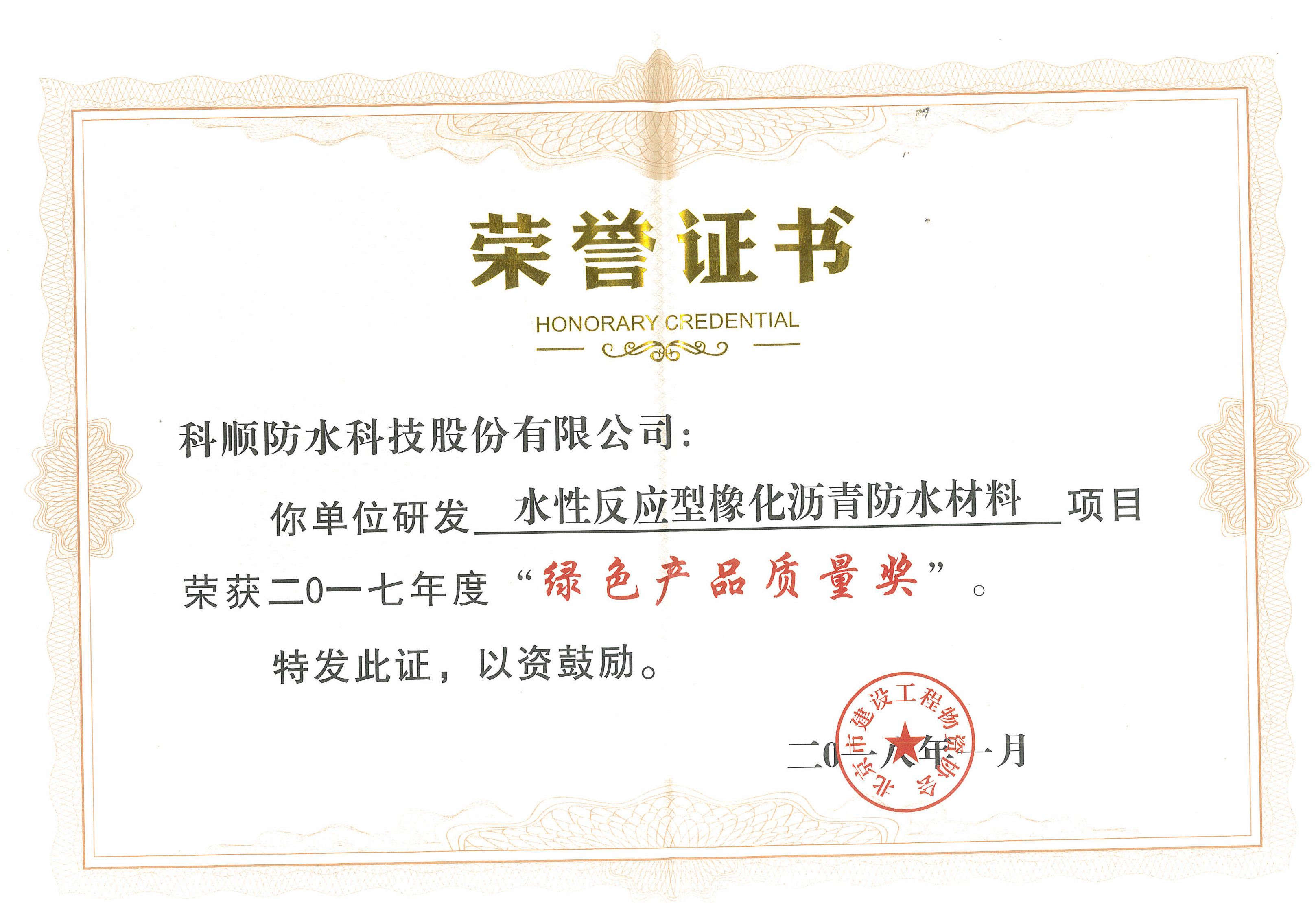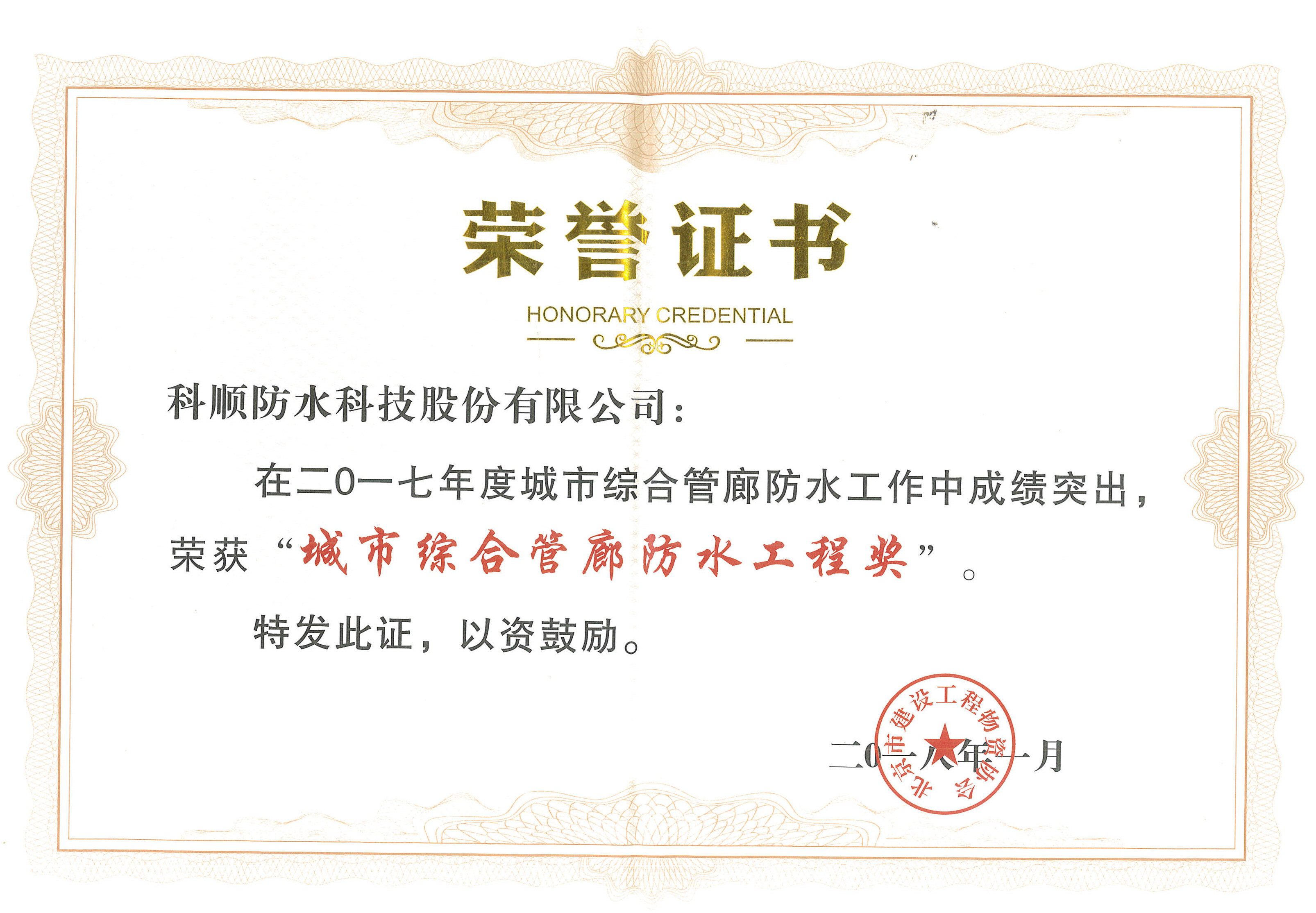 为表彰优秀会员,协会专家组评选出了各奖项名单。科顺股份依靠过硬的产品质量、雄厚的研发能力和完善的施工质量保障体系一举荣获“优秀工程奖”“创新成果奖”“绿色产品质量奖”和“城市综合管廊防水工程奖” 四项殊荣。另外,协会依据各企业近年在北京防水市场的信誉评价,授予科顺股份“进京防水产品供应及施工诚信单位”荣誉称号。