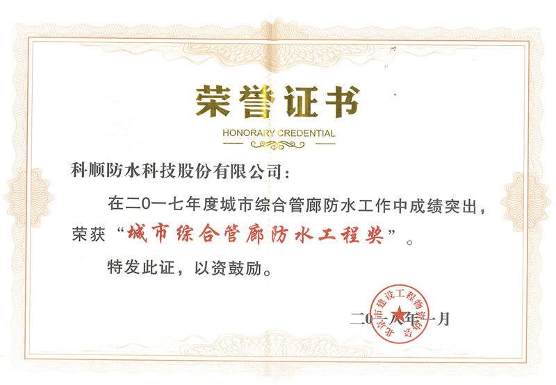 为表彰优秀会员,协会专家组评选出了各奖项名单。科顺股份依靠过硬的产品质量、雄厚的研发能力和完善的施工质量保障体系一举荣获“优秀工程奖”“创新成果奖”“绿色产品质量奖”“城市综合管廊防水工程奖” 四项殊荣。另外,协会依据各企业近年在北京防水市场的信誉评价,授予科顺股份“进京防水产品供应及施工诚信单位”荣誉称号。
