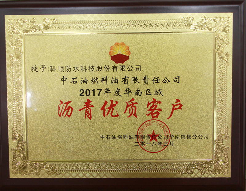 科顺股份荣获中石油2017年度华南区域沥青优质客户奖