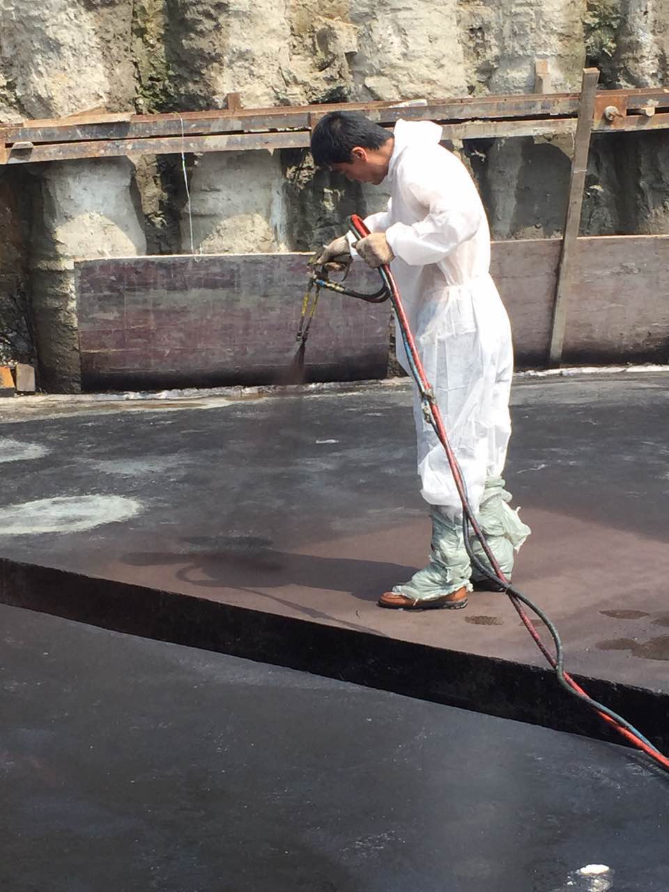 KS-560杰迅是科顺公司自主研发的一种环保多功能用途防护材料,由高性能改性乳化橡胶沥青和固化剂双组份组成,环保无毒、施工简便、快速成型,其高达1000%的断裂延伸率能有效适应结构变形。在施工方面,科顺公司采用了进口喷涂施工设备和先进的冷制冷喷技术,喷涂成膜,施工效率更高。此外,产品能极佳的适应梅雨季节的恶劣环境,只要无明水便可施工保证项目工期进度。KS-560杰迅与常规防水涂料最大的区别便是它的快速凝胶特点,只需3-5秒的时间,产品便已经像流汗一般析出涂料中的水份,快速成膜。