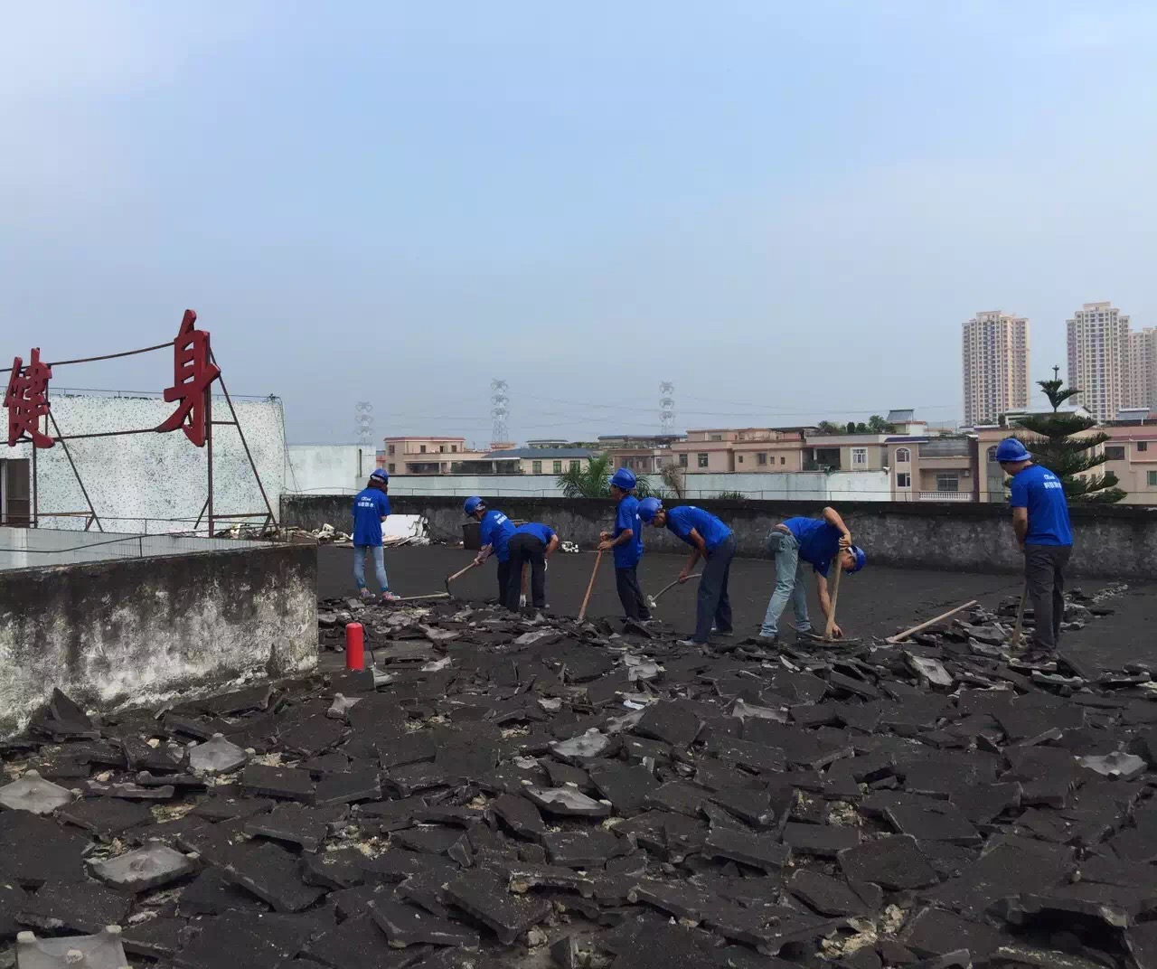 了解到高黎小学的情况后,在公司领导的指示下,科顺公司应用技术部工程师队伍迅速前往高黎小学进行实地考察。经过多次的现场勘察,工程师队伍发现,天面铺设的隔热砖已老化,因多年风吹雨打日晒雨淋后,已出现较为严重的面层碳化、各种各样的开裂等缺陷:四周女儿墙阴角接缝多处开裂造成直接渗水到外墙处,个别位置渗水严重已经渗透入内墙而发霉,内墙起泡、起粉、脱落等现象,量大面广,已经无法进行局部维修。