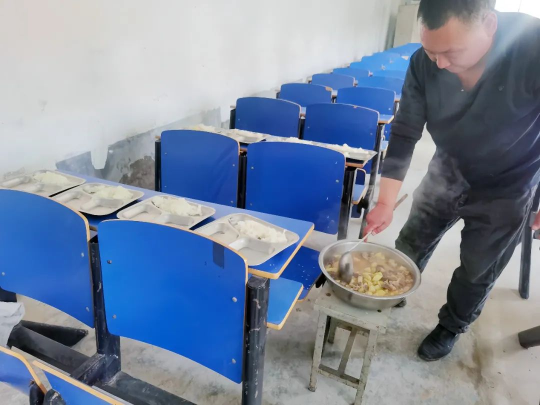 在学校新搭建的食堂里,校长袁兴书已经盛好饭菜。饥肠辘辘的孩子们,端起热气腾腾的餐盘,大口大口地吃起饭来。