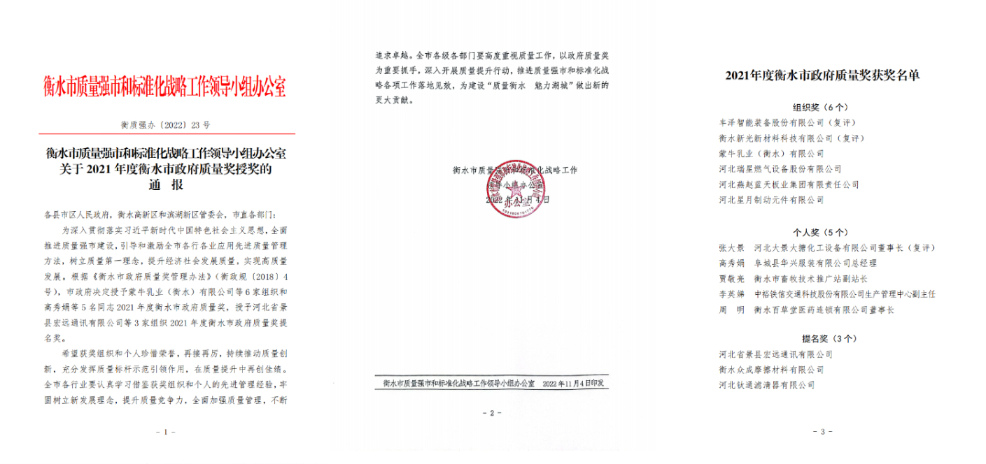近期,衡水市质量强市和标准化战略工作领导小组办公室发布了关于2021年度衡水市政府质量奖授奖的通报(2022年12月颁奖),其中6家企业荣获组织奖,丰泽股份名列榜首。