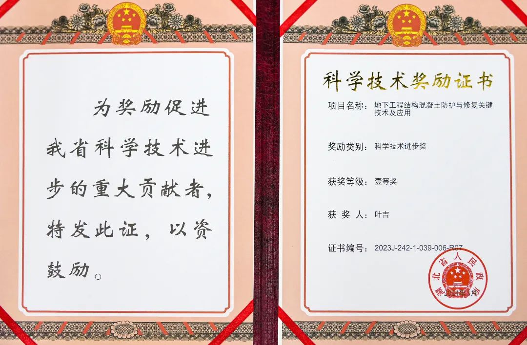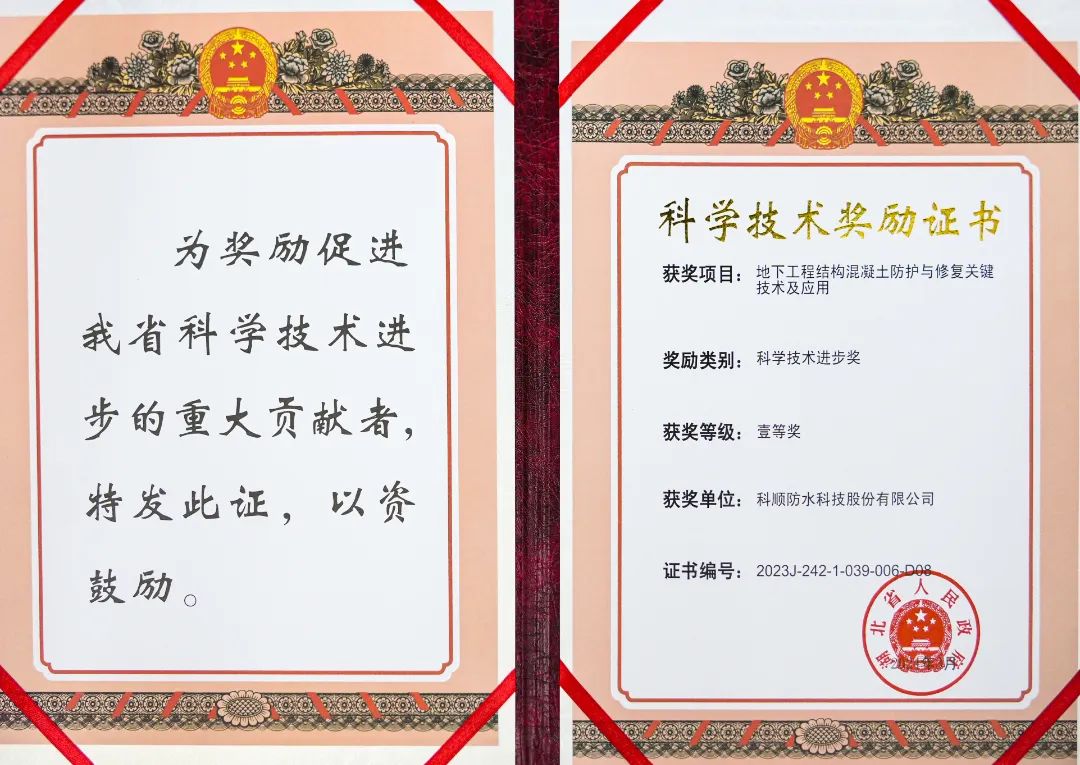 科顺股份与湖北工业大学等单位联合研究的《地下工程结构混凝土防护与修复关键技术及应用》项目,荣获2023年度湖北省科学技术进步奖一等奖。
