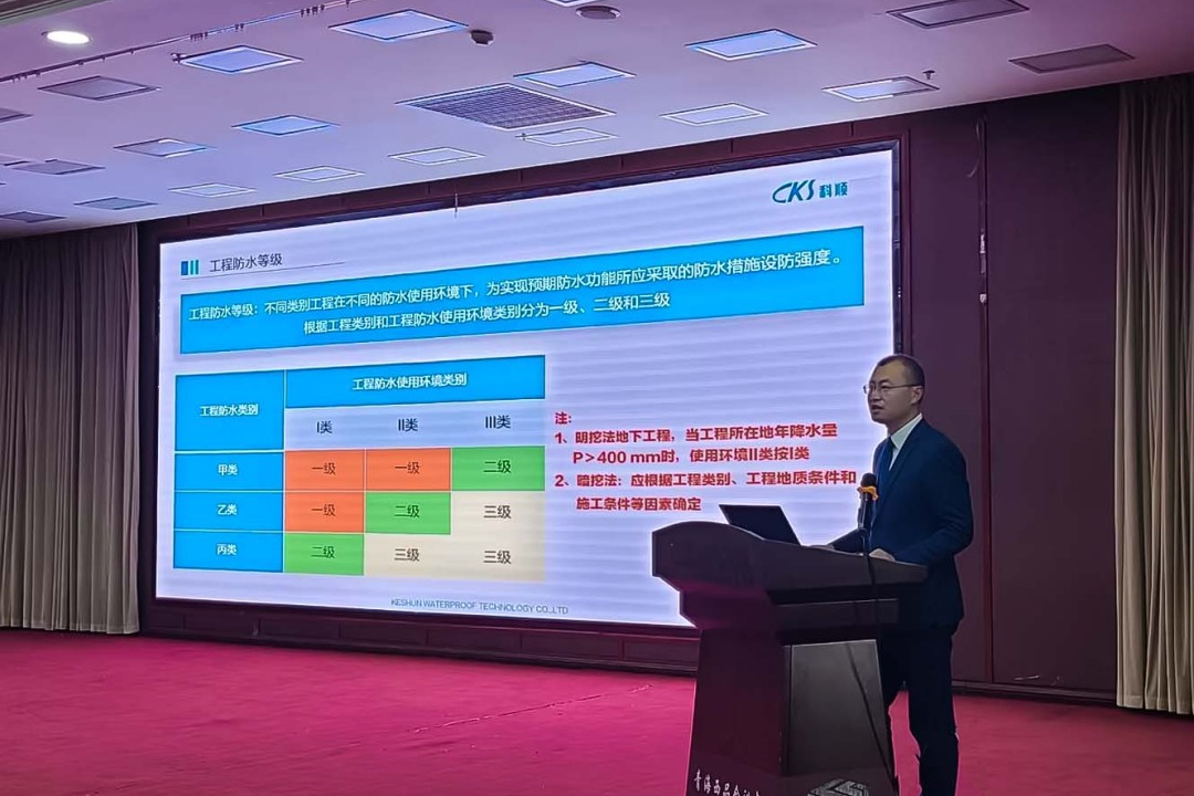 科顺股份是本次活动协办单位之一,也是《通用规范》的优秀参编单位之一,受邀为大会带来防水新规的深刻解读。工程建材集团华西大区驻场应用技术总监孙荣喜代表出席,向参会的上下游建筑业同行,解析新规的精神内核、主要内容和标准变化,并强调防水施工应遵循“因地制宜、以防为主、防排结合、综合治理”的基本原则。