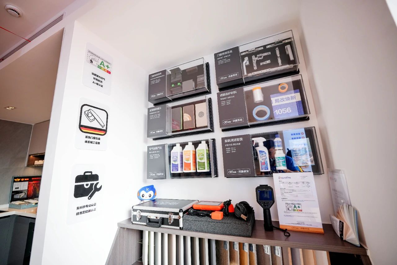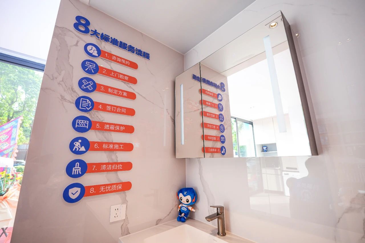 在工艺展示区,顾客可以直观了解防水修缮、墙面刷新、门窗焕新等主营业务的精湛工艺;综合选材区,集中展示科顺美家环保、高品质的防水材料,以及柜体板材的结构、花色;而模拟的生活场景空间,让顾客能近距离感受家居快装焕新的魅力:通过采用顶、墙、地面的装配式快装工艺,实现整体空间48小时品质交付,让家的焕新触手可及。