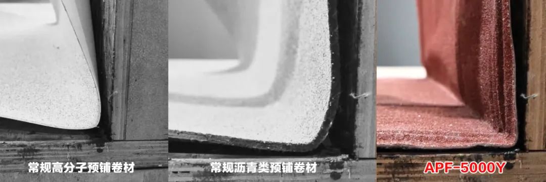 对比传统预铺材料,APF-5000Y 以多层强力交叉膜,作为主体增强材料,具有优异的抗撕裂强度和尺寸稳定性,更好抵御结构变形。