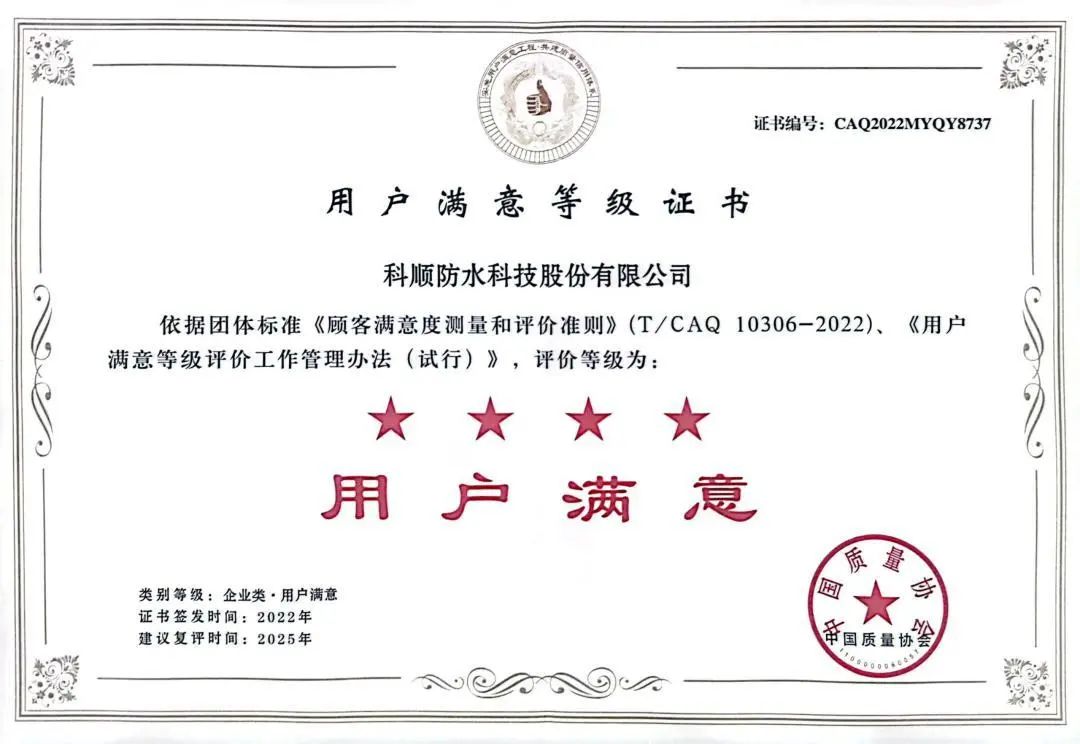 会上,科顺股份与中国联通、中国电信、中建钢构等优秀企业,共同获得用户满意四星级企业称号。