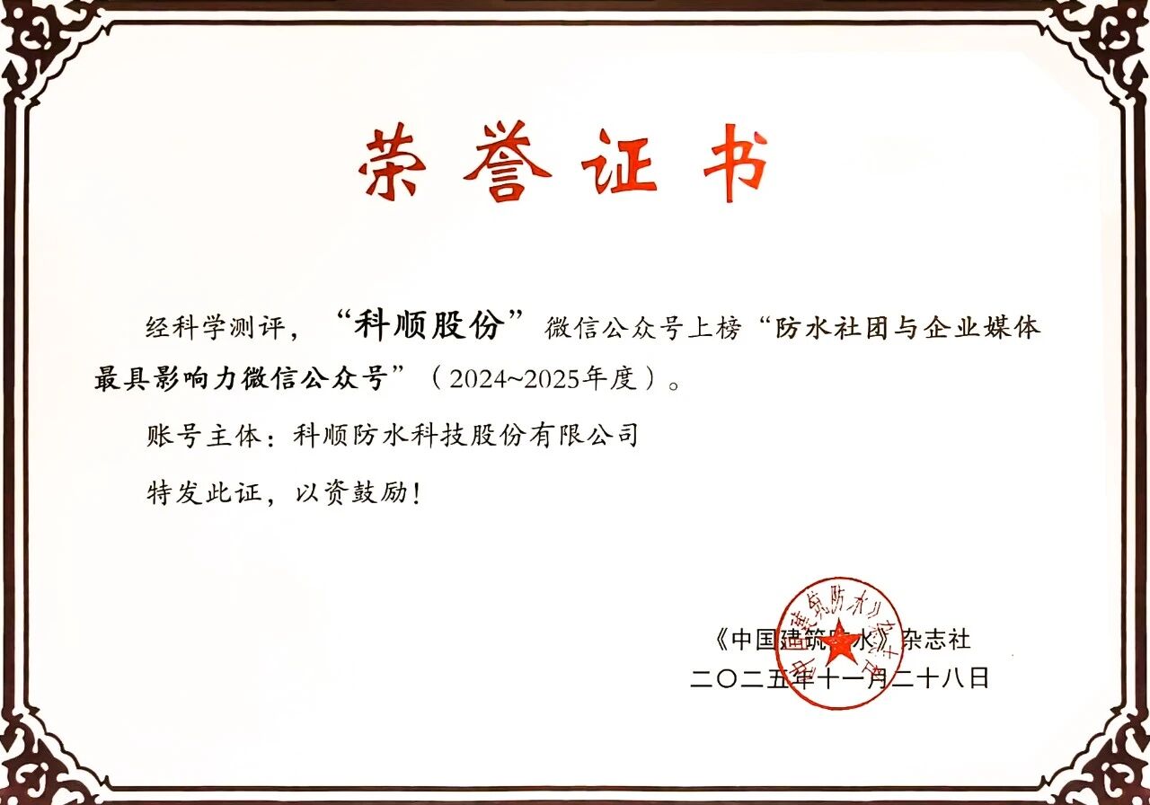 作为企业文化宣传与行业价值传递的核心载体,科顺股份微信公众号自运营以来,始终以原创为底色,既聚焦企业技术成果、工程实践等核心内容,又紧密跟进防水行业政策导向与发展动态,在传递品牌价值的同时,全力助推防水行业高质量发展。这份荣誉不仅是对科顺品牌传播工作专业性的认可,更是对其在行业内传播影响力的肯定。