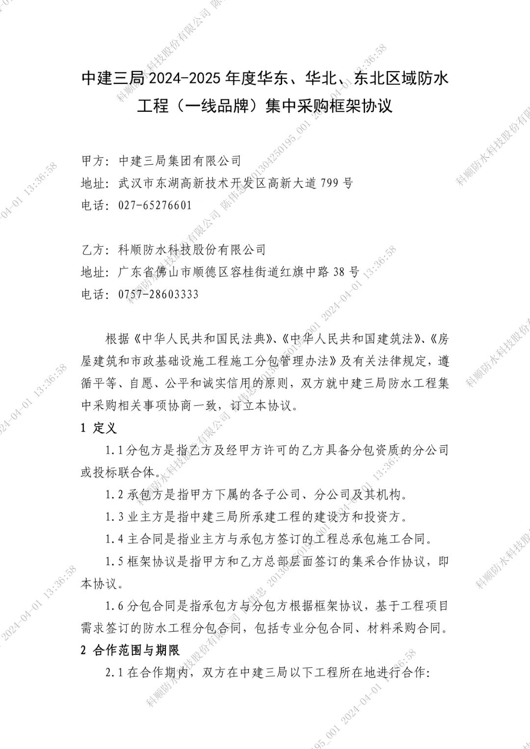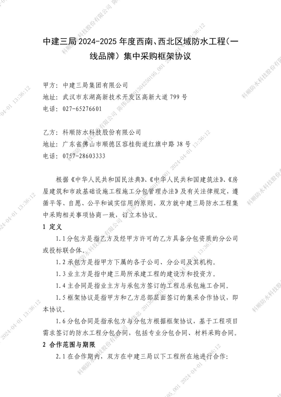 近期,科顺股份正式签约中建三局防水工程集采战略,将在全国区域范围内(华东、华南、华中、华北、东北、西南、西北等)开展防水专业深度合作。