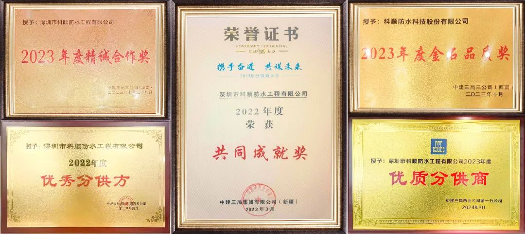 合作过程中,科顺股份高效配合项目建设,以品质供应、敏捷交付、标准化施工、价值服务,赢得中建三局认可,屡获“优秀供应商”“优质分供商”等称号。
