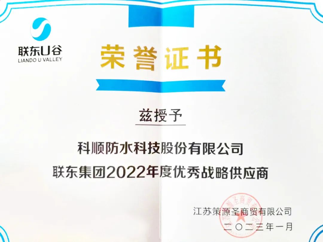 近日,科顺股份捷报频传,喜获联东集团“2022年度优秀战略供应商”称号!