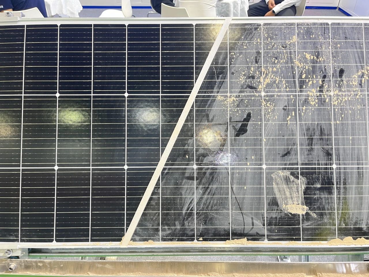 光伏专用纳米自清洁涂层展台,粉尘模拟光伏常见污染,涂层样板污渍残留率仅3%。