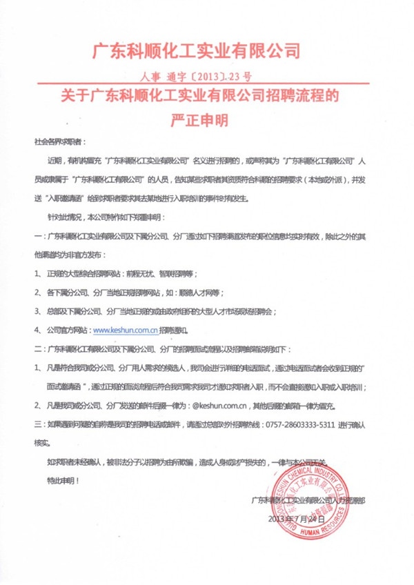 近期,有机构冒充“广东科顺化工实业有限公司”名义进行招聘的,或声称其为“广东科顺化工有限公司”人员或隶属于“广东科顺化工有限公司”的人员,告知某些求职者其资质符合科顺的招聘要求(本地或外派),并发送“入职邀请函”给到求职者要求其去某地进行入职培训的事件时有发生。