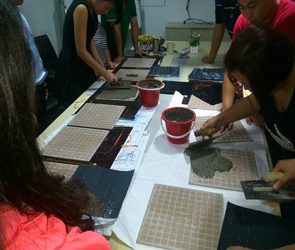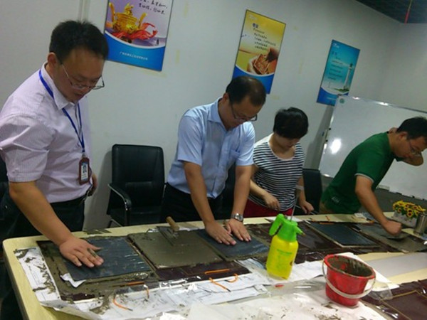 “施工”前大家分工协作,裁卷材、泡磁砖、搅拌水泥,“施工”中大家相互学习,相互比拼,相互交流,每个人均表现出高度的学习热情。通过此次身体力行的实践培训,不仅巩固了业务团队对产品知识的了解,强化了业务环节的技术性与专业性,更为他们与客户进行直面交流奠定了扎实的基础。