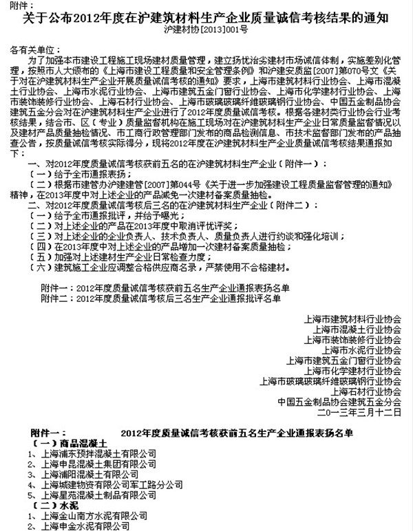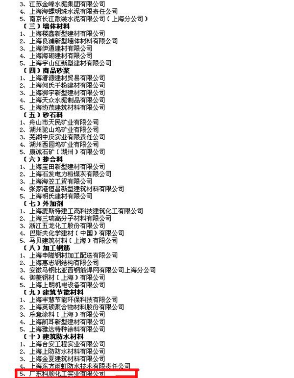 近期,上海市建设工程安全质量监督总站签发了沪建材协[2013]001号《关于公布2012年度在沪建筑材料生产企业质量诚信考核结果的通知》,该通知是上海建筑材料行业协会、上海市化学建材行业协会等九家协会对在沪建材产品进行质量抽检而产生的结果。广东科顺化工实业有限公司凭借多年来诚信经营、质量唯先的理念,通过了重重考核,位列建筑防水材料2012年度质量诚信考核前五名,并在上海市化学建材行业协会网上(http://www.shhjxh.com/Shownews.asp?id=1036)被予以通报表扬。