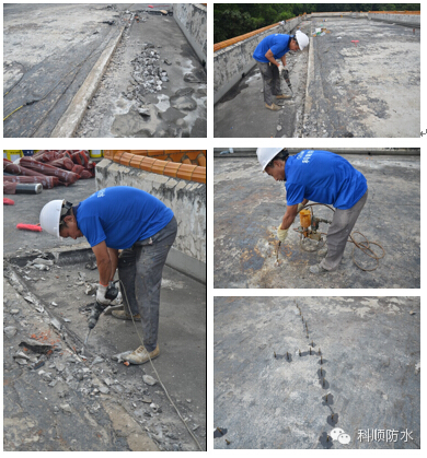 在公司的有效推动下,7月10日,专业的科顺防水施工队伍开始了堵漏维修工作。根据技术部的专业方案,工人先将原有的老化防水层(由聚氨酯防水涂料和无纺布组成)铲除,并将新老屋面交界处的砖墙压顶去除,针对混凝土交界处的缝隙进行了专业处理,在结构屋面板上有裂缝处进行化学注浆,完成后按屋面一级设防的要求,采用了目前先进的复合防水层系统施工。