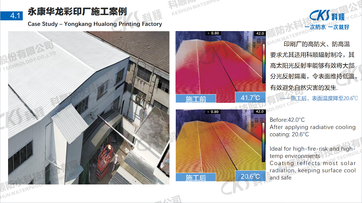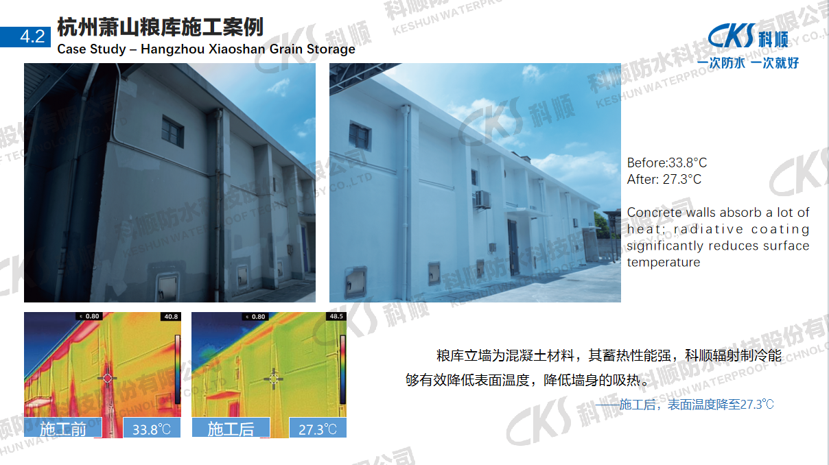 目前已在永康华龙彩印厂、杭州萧山粮库等项目落地应用,夏季屋面温度稳定控制在35℃以下,防水效果零投诉,节能效益显著。
