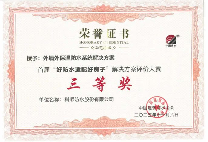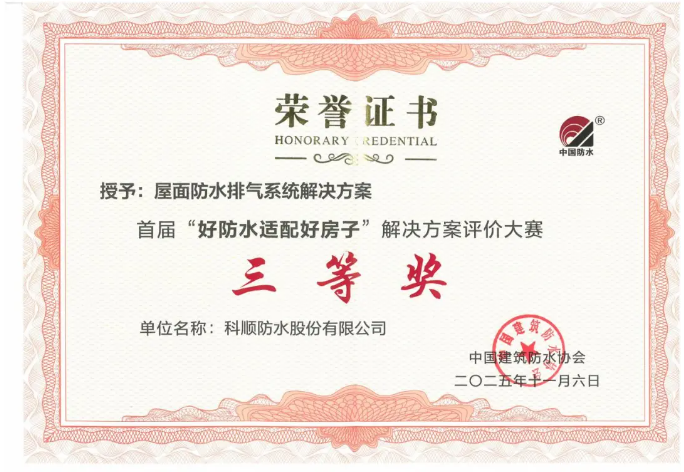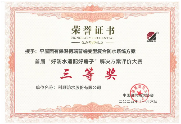 近日,首届「好防水适配好房子」解决方案评价大赛落下帷幕,科顺防水科技股份有限公司凭借《既有建筑屋面自洁型辐射制冷防水一体化解决方案》,在众多参赛作品中脱颖而出,斩获仅7席的一等奖,另有多项方案同步荣获三等奖。此次奖项的集中斩获,不仅彰显了科顺在防水领域的全场景技术实力,更以一等奖方案的创新突破,为“好房子”建设树立了防水与节能一体化的新标杆!