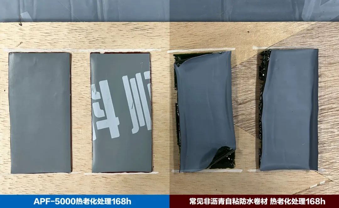一些非沥青自粘防水卷材在热老化处理后(80°。168h)内聚力严重下降,胶料不成形,容易受外力破坏,失去正常卷材应有的强度;