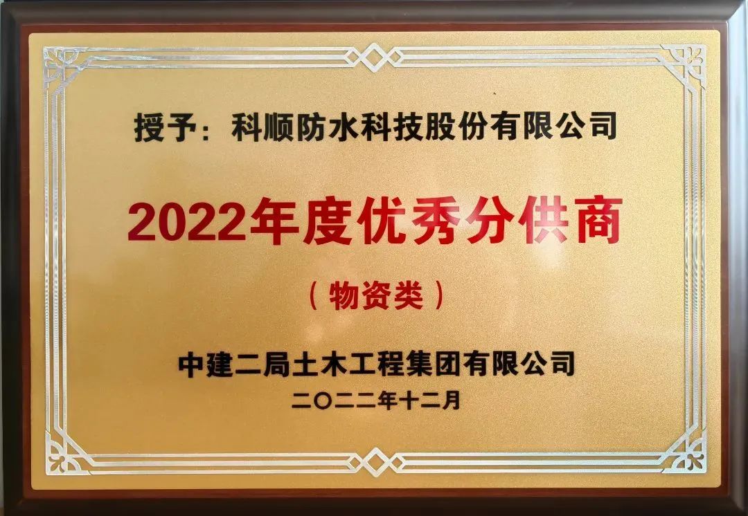 近年,凭借超越期待的服务和质量过硬的产品,科顺股份连续斩获中建二局旗下东莞分公司"优秀供应商"、第四建筑工程公司"优质供应商"、土木工程集团"优质分供商"等多项殊荣,成为中建二局供应链体系中最具成长性的合作伙伴之一。
