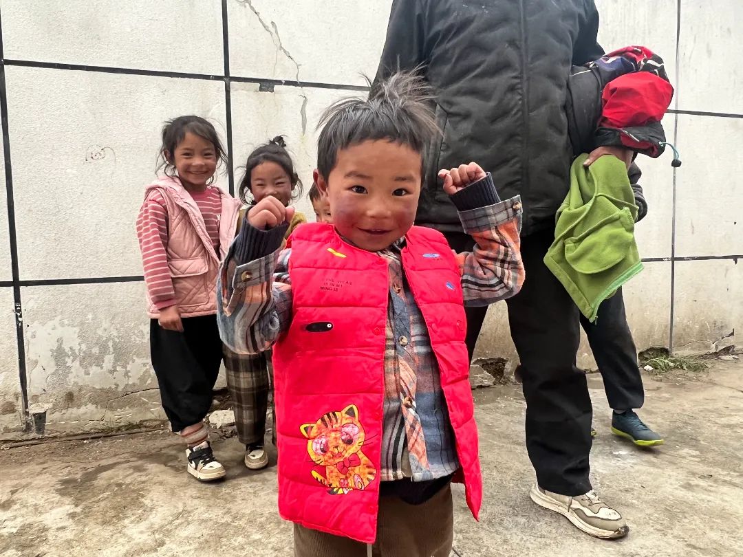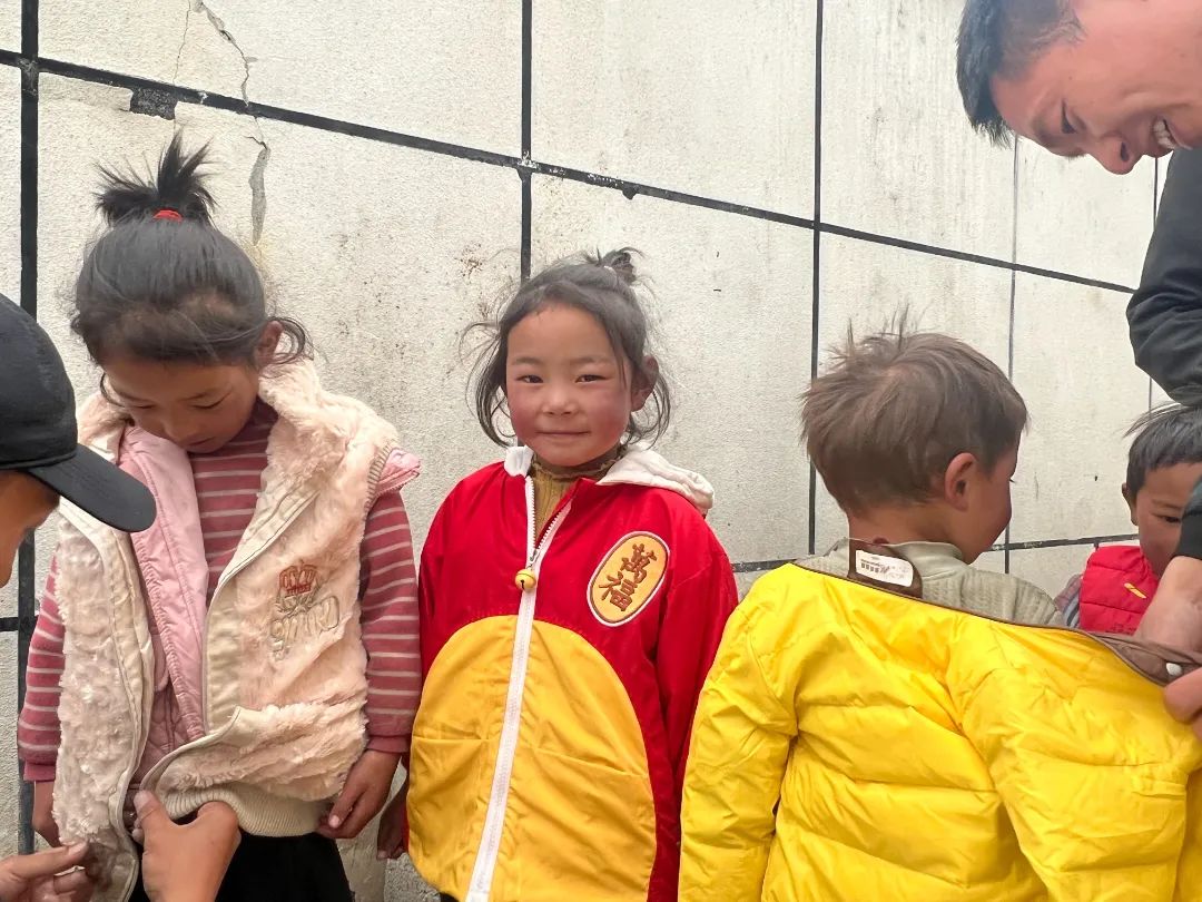 村里的小孩穿上新毛衣、新外套、新裤子,淳朴的脸上难掩喜色。在这个雪山难行、物资匮乏的偏远小山村里,漂亮、温暖、舒适的衣服,是一份珍贵而又难忘的礼物。