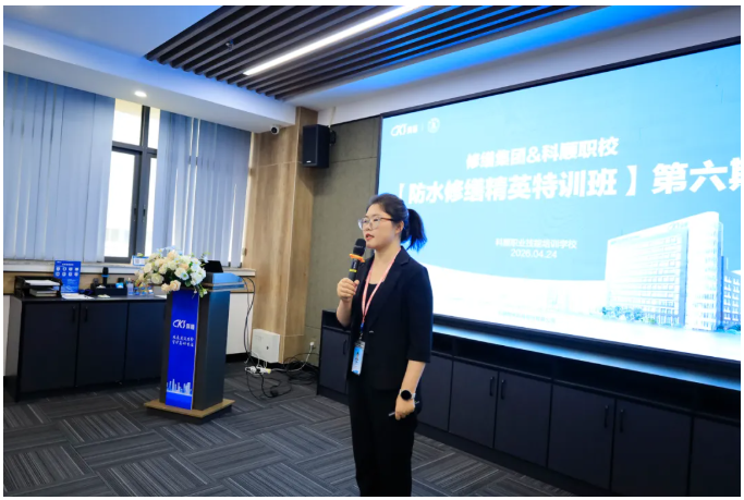 开营仪式上,修缮集团董事长李茜总为本次特训班致开班辞,围绕集团"全力以赢"年度核心战略,深度复盘修缮业务发展成果,精准拆解行业发展趋势与市场机遇。 她明确了本次特训班"以实战育人才,以人才促增长"的核心目标,强调防水修缮赛道的竞争,核心是专业能力的竞争。唯有持续打磨技术硬功、精进服务能力,才能在市场浪潮中站稳脚跟。