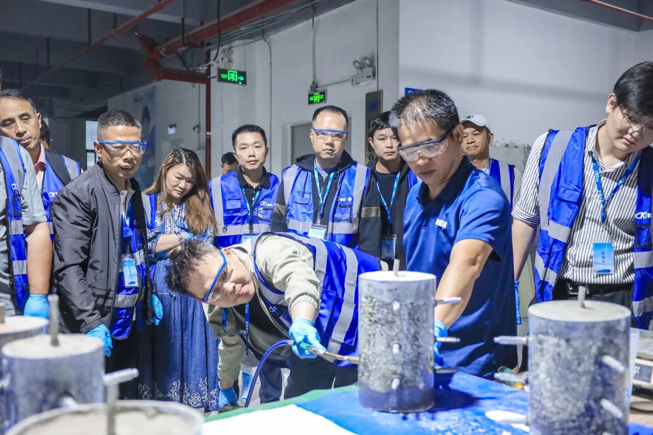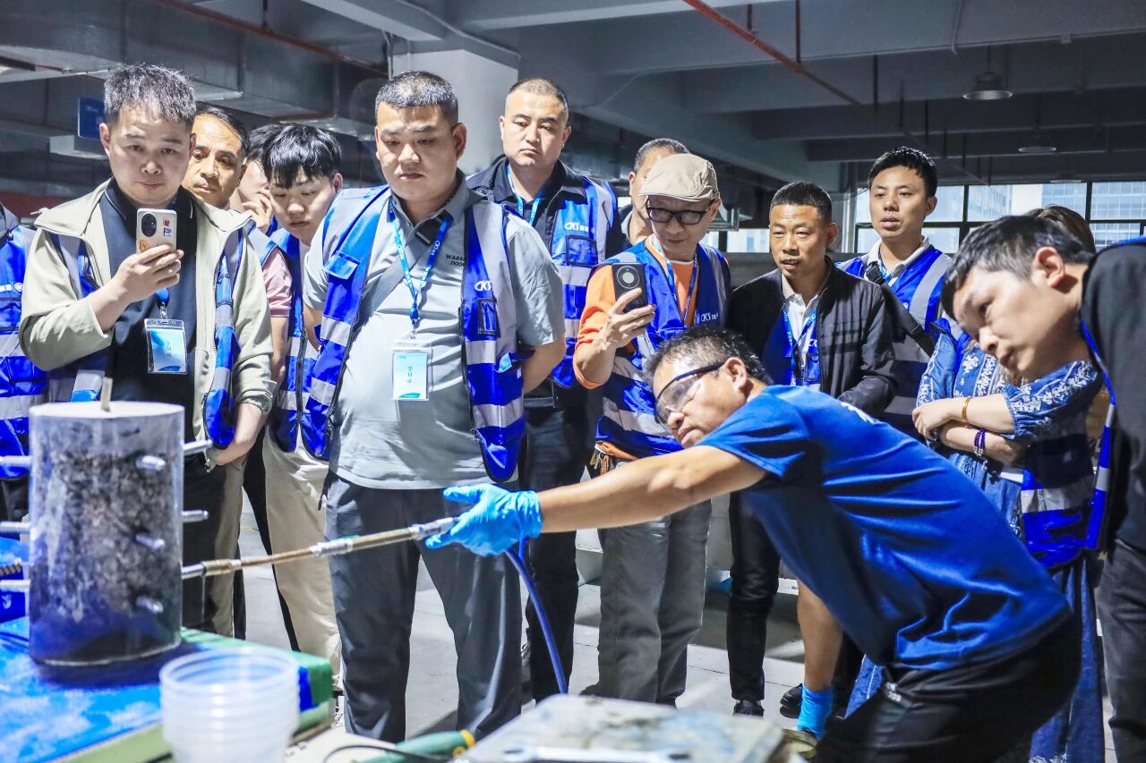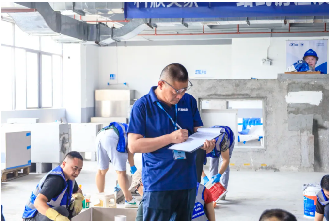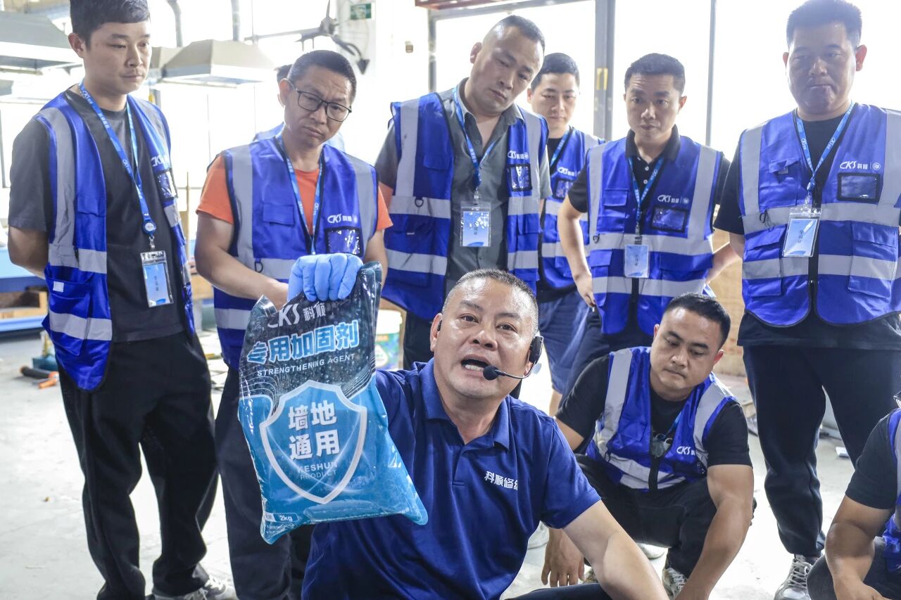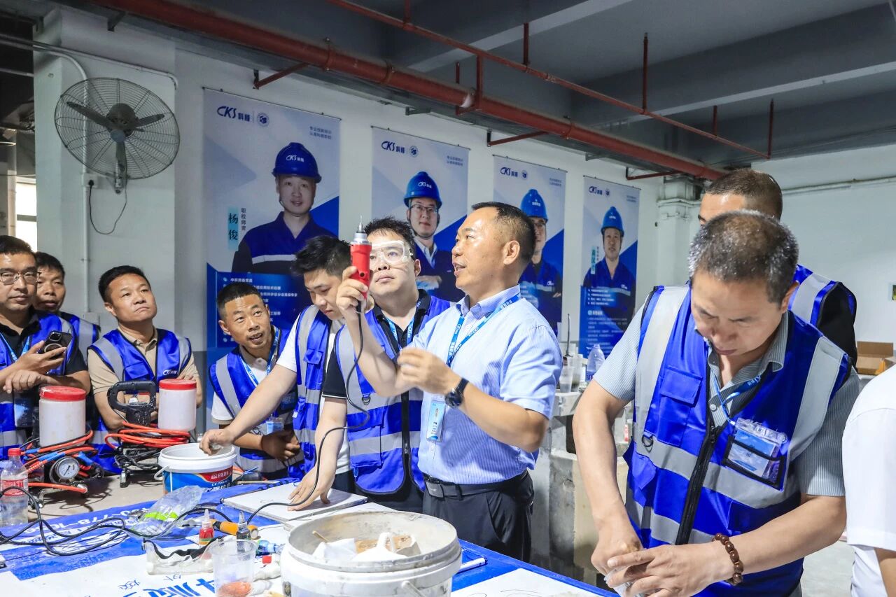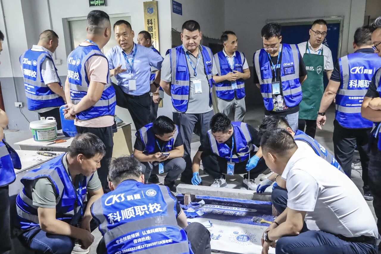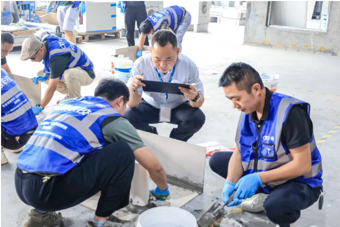 实操环节在华南实训基地开展,丁贵奇、郭涛、黄汉青等技术老师全程手把手带教,学员完成厨卫听漏、一布三涂、结构加固、瓷砖空鼓修复等实战演练。培训期间,大家还走进集团总部展厅,深入了解品牌与产品体系,强化品牌认同。