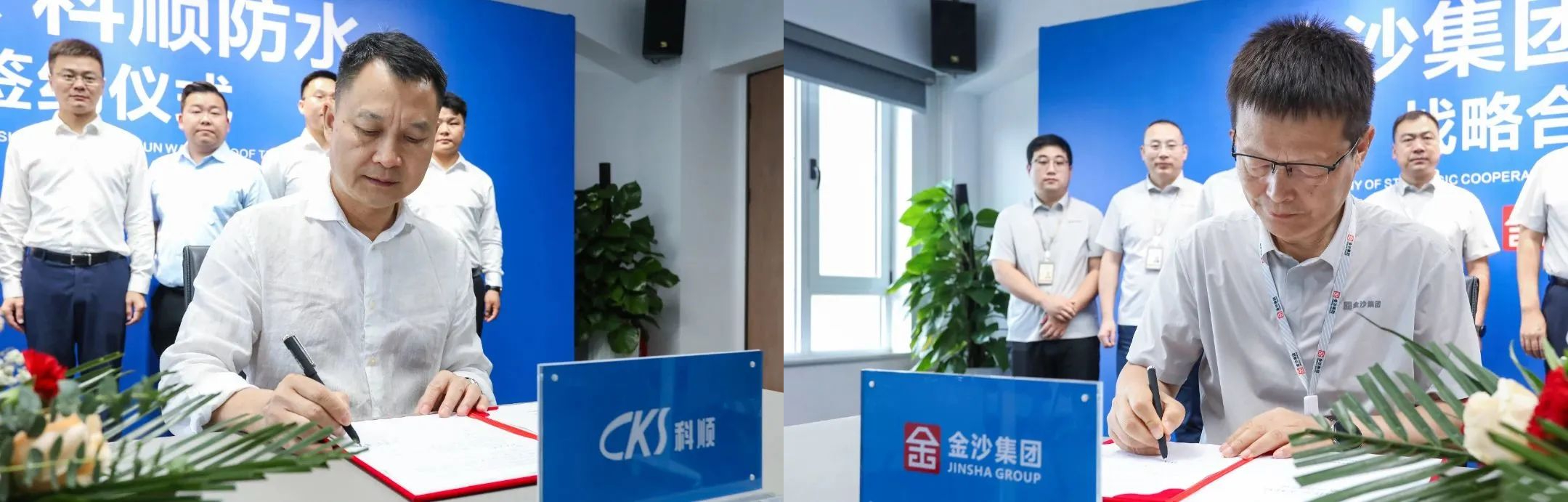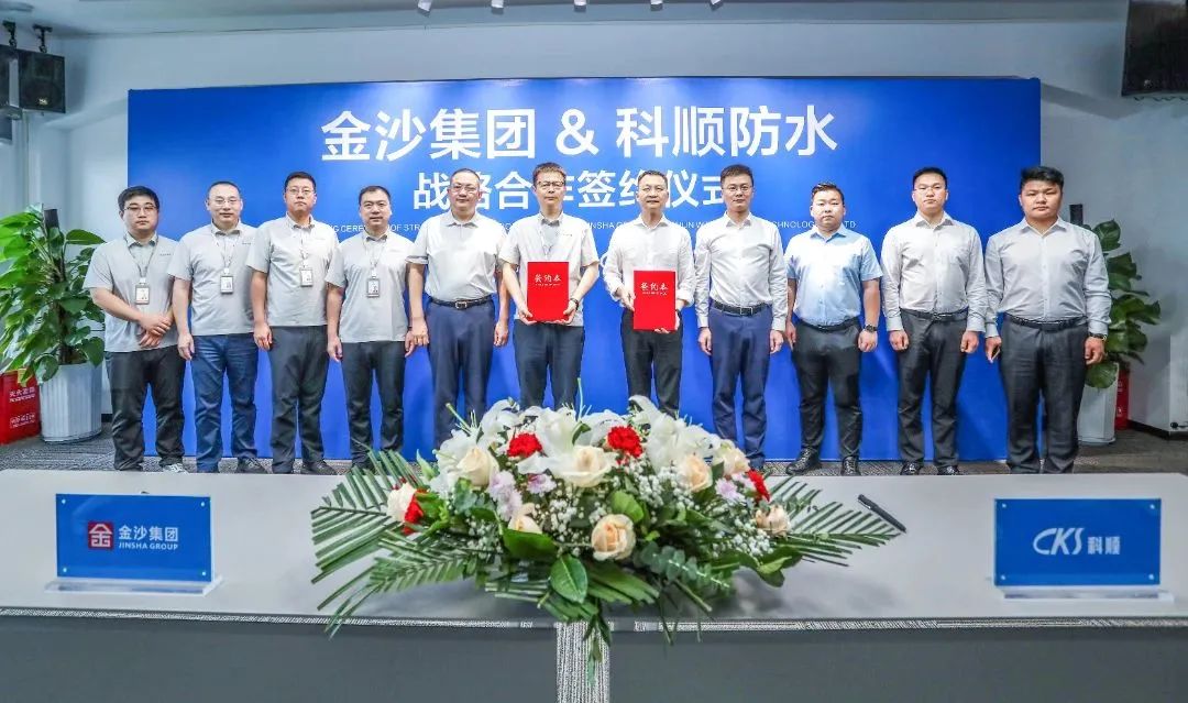 金沙集团董事长杨利民、集团总裁张永涛、集团副总裁吴建强、集团招采成本中心总经理耿定忠,科顺股份集团董事长陈伟忠、集团营销中心大客户管理部总监李洪林等领导,共同出席签约仪式。