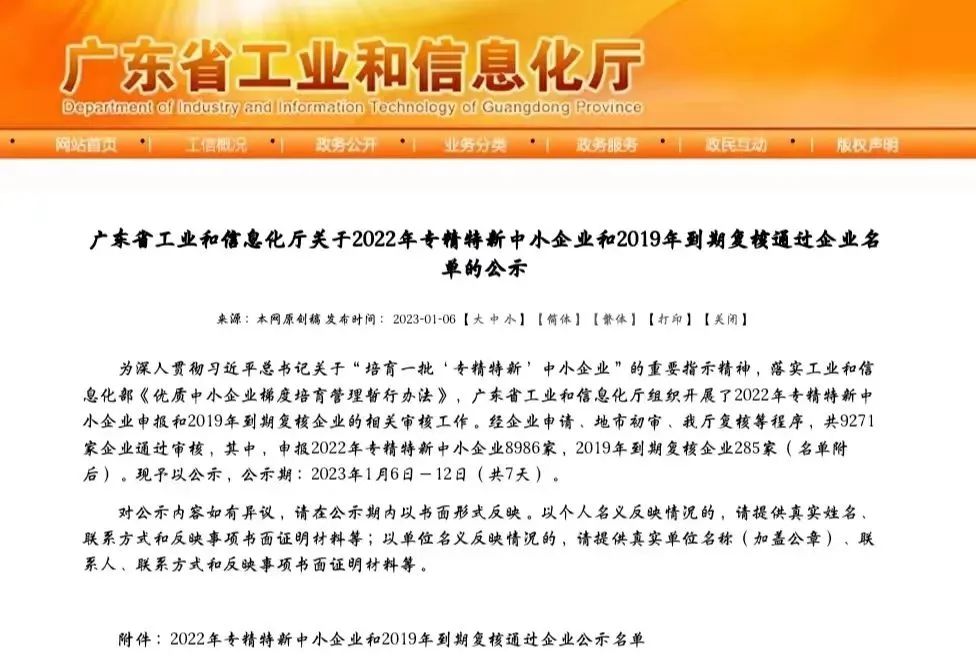近日,广东省工业和信息化厅发布《关于2022年专精特新中小企业和2019年到期复核通过企业名单的公示》。经企业自主申报、严格审查、专家评选、审核复核等程序,科顺股份及佛山科顺(科顺佛山生产基地)通过认定,成功获评2022年度广东省“专精特新”荣誉!