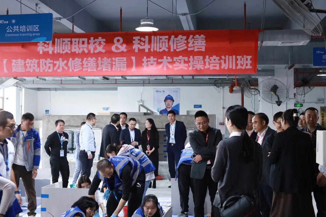 During the event, Keshun Vocational Skills Training School was officially designated as the "Guangdong-Hong Kong-Macao Greater Bay Area Waterproofing Vocational Skills Training Base." Leaders from the Guangdong-Hong Kong-Macao Greater Bay Area Waterproofing Industry Alliance conducted an in-depth survey of the Keshun Vocational Skills (South China) Training Base to understand the construction and quality of teaching.