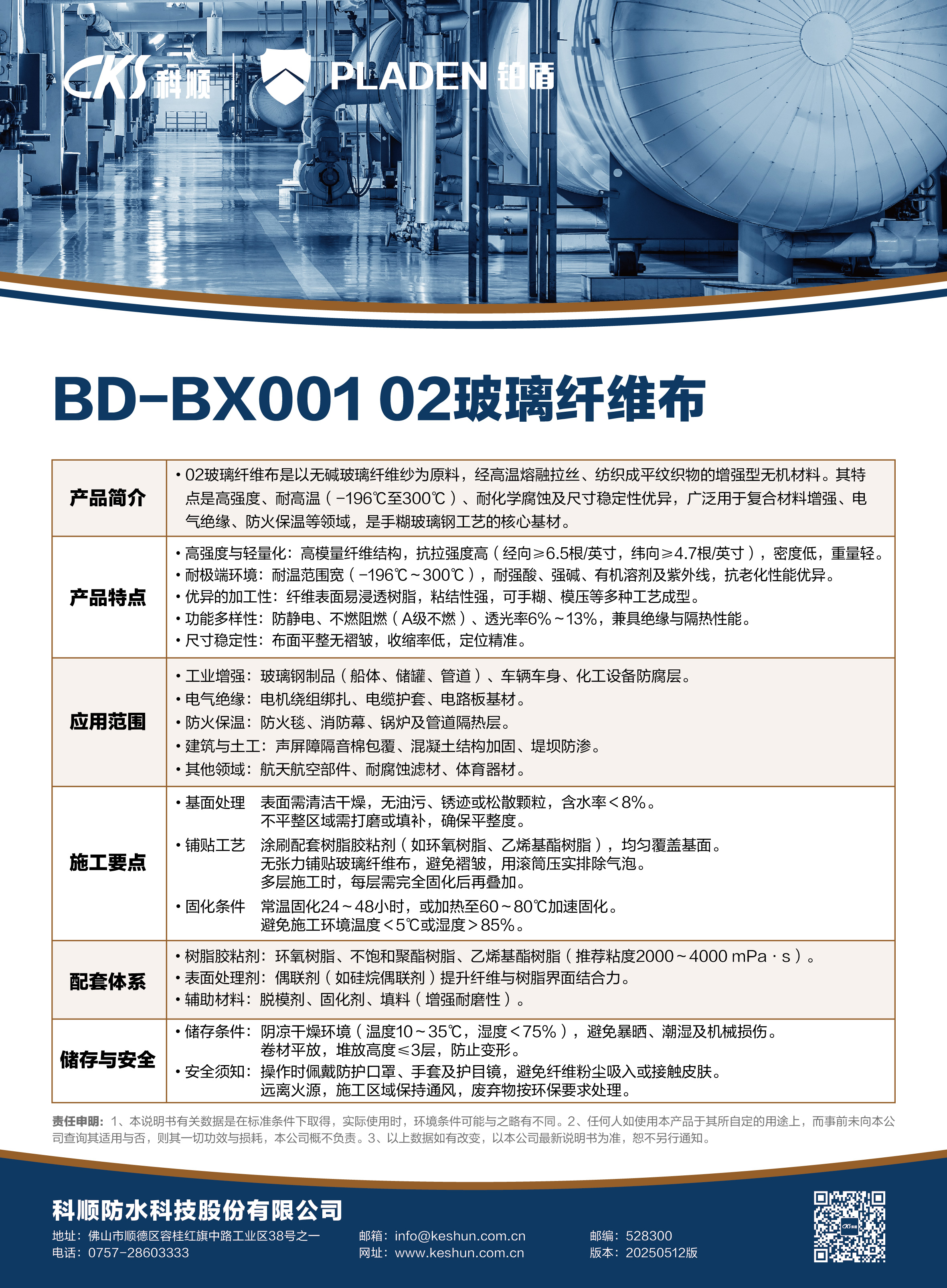 02玻璃纤维布是以无碱玻璃纤维纱为原料,经高温熔融拉丝、纺织成平纹织物的增强型无机材料。其特点是高强度、耐高温(-196℃至300℃)、耐化学腐蚀及尺寸稳定性优异,广泛用于复合材料增强、电气绝缘、防火保温等领域,是手糊玻璃钢工艺的核心基材。