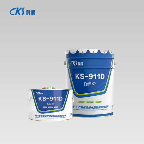 KS-911D低VOC石墨烯双组分聚氨酯防水涂料,A组分是以聚醚和异氰酸酯为主要材料聚合反应制成的预聚物,B组分配以多种助剂、填料等混合制成。A、B组分按一定配合比搅拌均匀,涂刮在基面上,固化后形成整体而富有弹性的防水胶膜。产品为高固含量、低VOC、环保型聚氨酯防水涂料,特别适用于通风性差的区域施工。