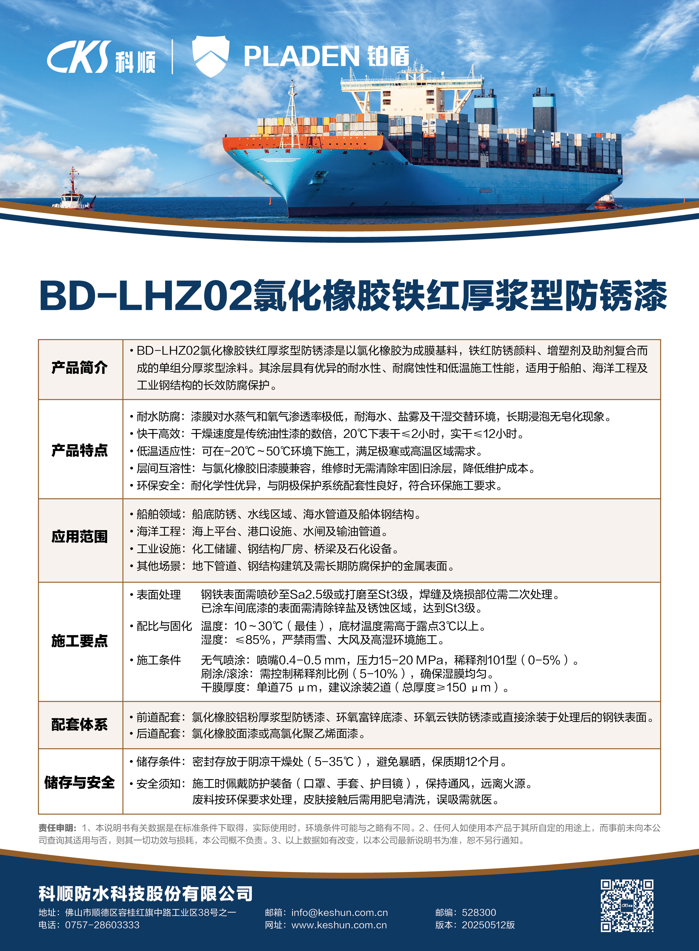 BD-LHZ02氧化橡胶铁红厚浆型防锈漆是以氣化橡胶为成膜基料,铁红防锈颜料、增塑剂及助剂复合而成的单组分厚浆型涂料。其涂层具有优异的耐水性、耐腐蚀性和低温施工性能,适用于船舶、海洋工程及工业钢结构的长效防腐保护。