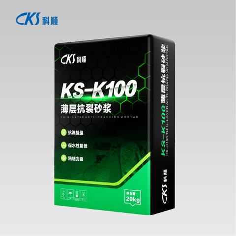 KS-K100薄层抗裂砂浆是一种以优质水泥、精致砂及多种高分子化合物配制而成的找平砂浆,适用于加气砖墙、混凝土墙及平整度 小于5mm 的红砖墙等墙面的抹灰找平,产品具有高强粘结不空鼓、表面强度高不脱粉、保水能力强抗开裂、批刮爽滑易施工等特点。