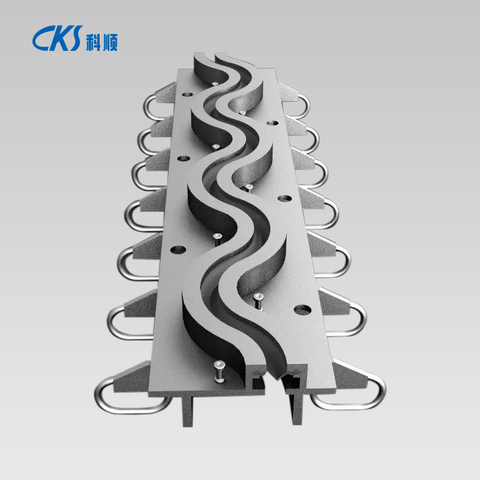 抗冲击减噪S型伸缩装置结构设计合理使车轮不同时冲击型钢减少了车载对伸缩装置的冲击强度(缓解疲劳)并减少了噪音,提高了伸缩装置的使用寿命及驾车舒适性、安全耐久(超长寿命)、外形美观。