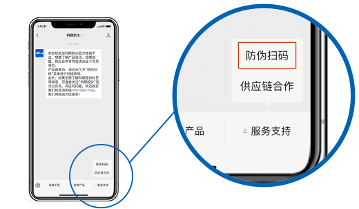 1、刮开产品标签上的防伪涂层,用微信扫码功能扫描左下方防伪码。