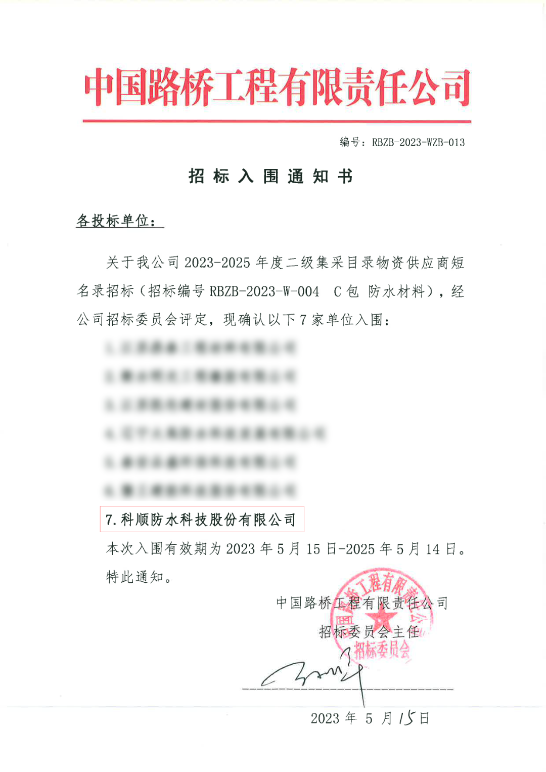 近日,中国路桥发布2023-2025年度二级集采目录物资供应商短名录入围结果。科顺股份成功入选防水材料供应商名单,将在全球市场范围内,与中国路桥开展防水材料战略集采的深度合作。